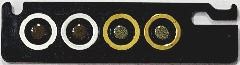 El detector tiene cuatro elementos circulares, dos de borato de litio Li2B4O7:Cu y dos de sulfato de calcio CaSO4:Tm cada uno encapsulado en teflón transparente y fijo en la tarjeta de policarbonato sólido. Cada elemento circular de 3 mm de diámetro contiene gránulos de cristales TL. |